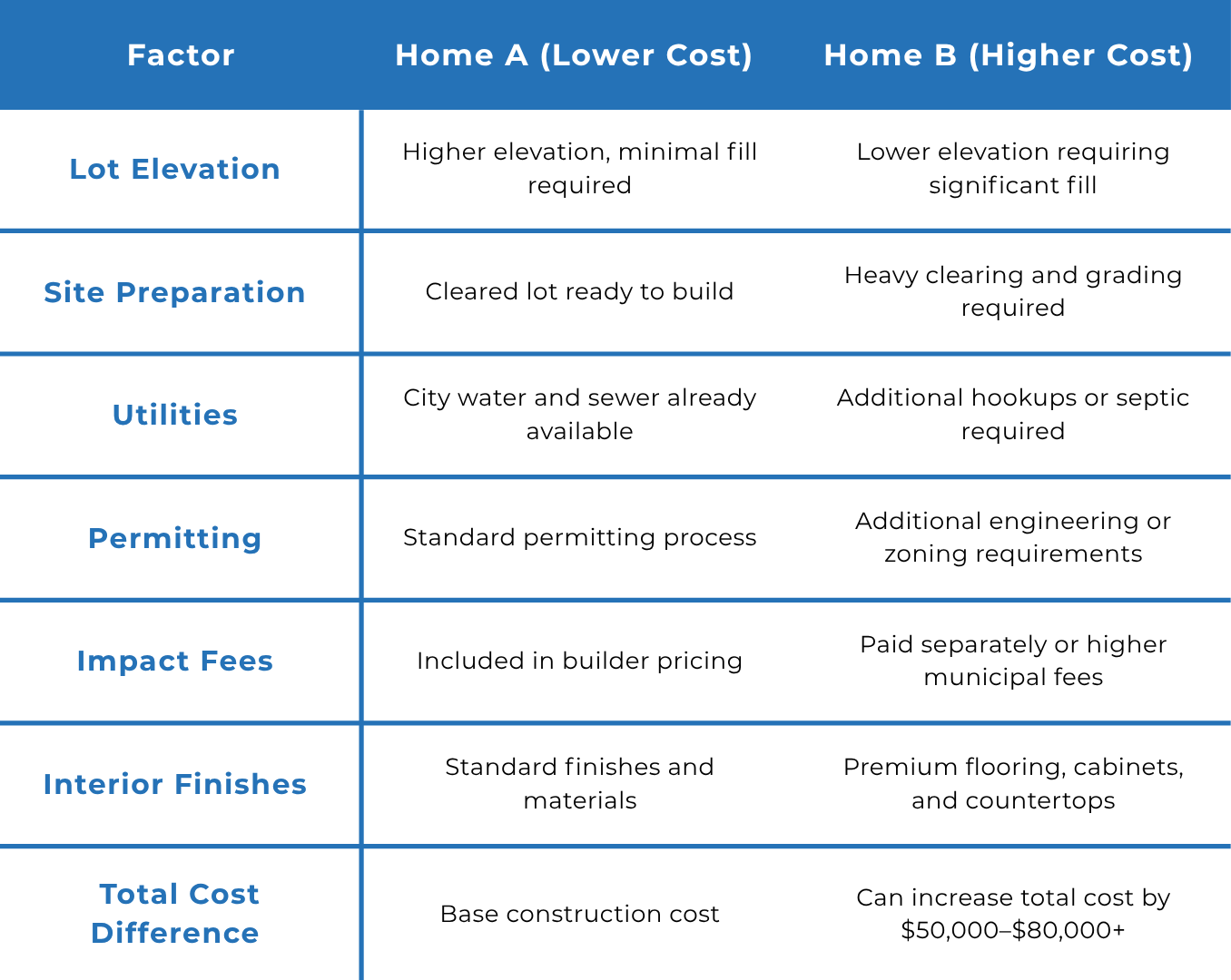 Even though the homes themselves may be identical, these external factors can significantly impact the final construction price.