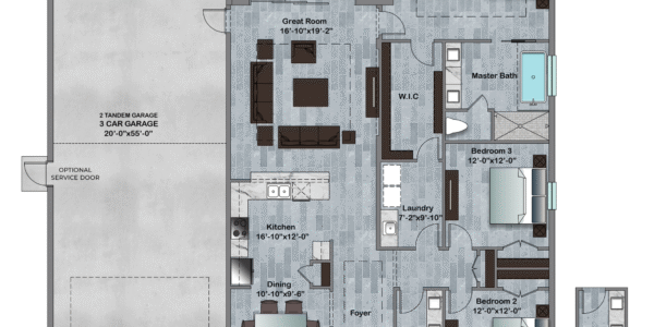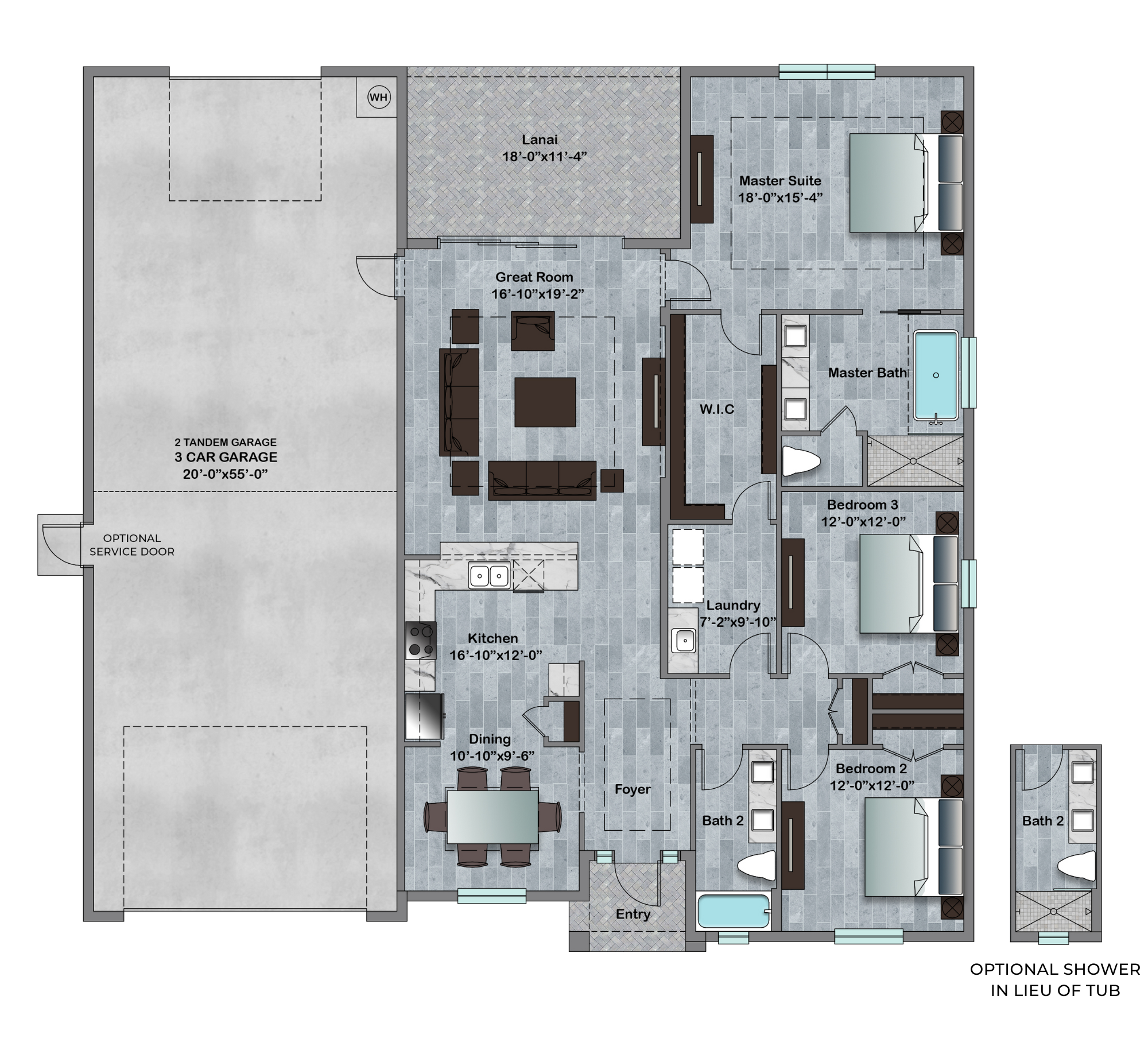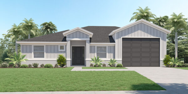 Designed with an over-sized garage running the full length of the house, The Garage Home offers over 1000 square feet of covered storage space which is perfect for an RV, Boat or a workshop. This 3-bedroom, 2 bath home features an open foyer and dining room upon entering. The dining room flows into the well-designed kitchen with large wrap around counter that overlooks the great room. With garage door access off the main living area, easy entry and exit was well thought out. The double sliders at the back of the home offer natural light that lead onto a covered lanai. Two bedrooms at the front of the home are conveniently located near the spacious laundry room and full bath. The master suite features a tray ceiling, large walk-in closet and master bath with double vanity as well as over-sized shower and tub. Available in your choice of Modern, Transitional or Coastal design, the Garage home is sure to surpass your storage needs and offer spacious living area.