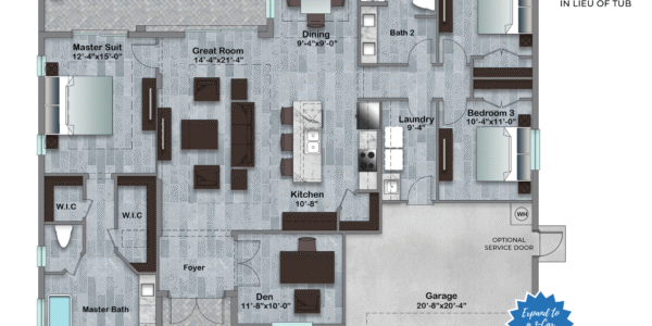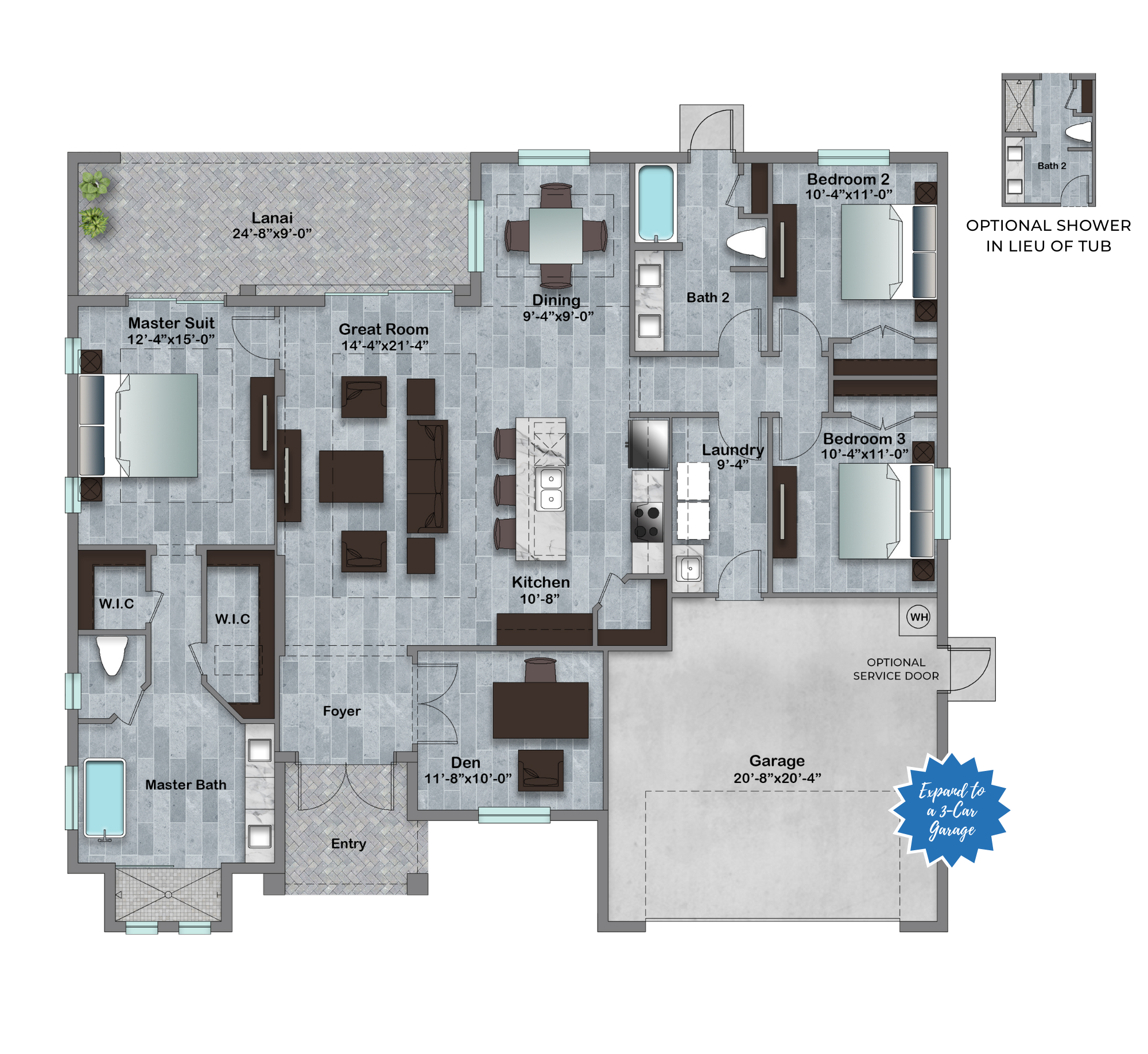 A charming home with double door entry under the covered portico, the Signus comes in your choice of a Modern, Transitional or Coastal design. It is an open and spacious split floor plan featuring three bedrooms, two-baths and den. It has trey ceilings in the foyer, living room and master bedroom. The dining room, great room and kitchen make up the central portion of the home with sliders at the back of the home opening to an extended lanai beyond which has room for the optional outdoor kitchen. The open, airy kitchen features a center island and corner pantry. The master suite is loaded with features including his and hers walk-in closets, a linen closet, double vanity, soaking tub and spacious shower. On the other side of the home, two bedrooms and a pool bath complete the balance of the living space.