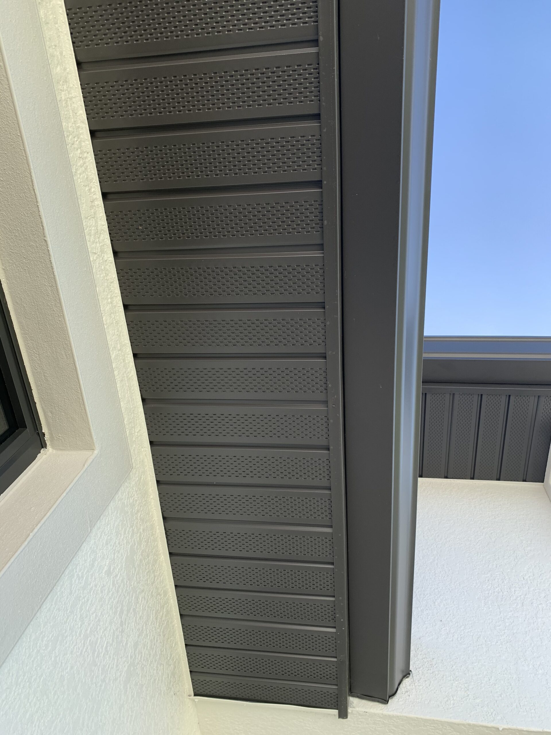 Vented soffits are installed into the underside of your home’s eaves or roof overhang. They run the entire perimeter of the roof line and have small holes that allow natural air flow to the attic. Soffit vents are designed to draw outside air up into the attic and with the use of insulation creates the proper air flow system to be pushed back out another area of vented soffits.