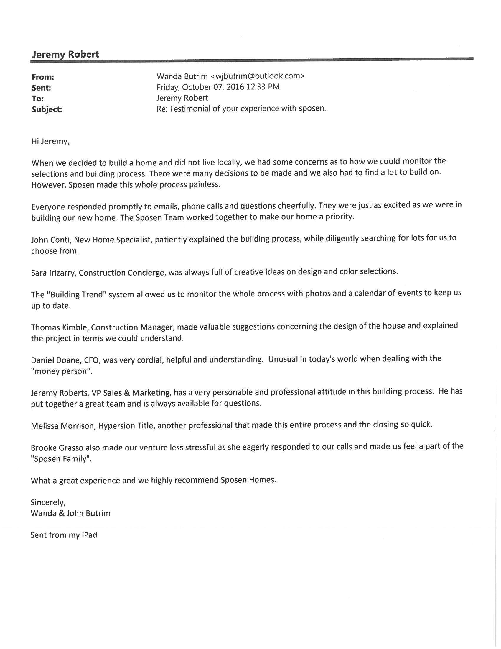 Sposen Homes Reviews and Testimonials John and Wanda Butrim: