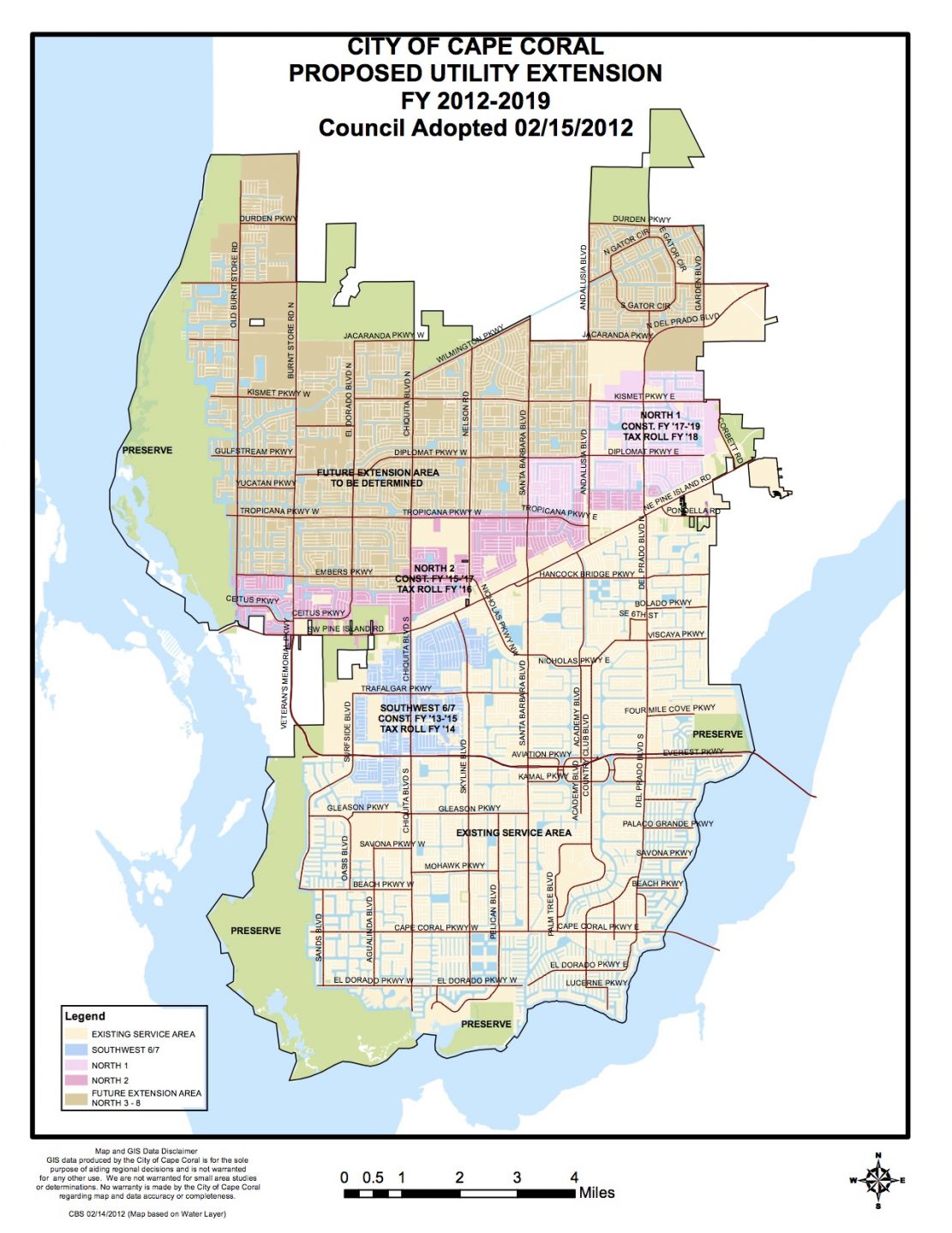 In 1957, when Cape Coral was founded it was a developing rural community. The infrastructure was not in place to provide public utilities and municipal services to all areas of Cape Coral, which spans an area of 120 square miles. At that time, property owners within service areas were given options to pay off assessments for services to their parcel.  They could pay the amount in full, defer until they built, or make payments on a 20-year plan.